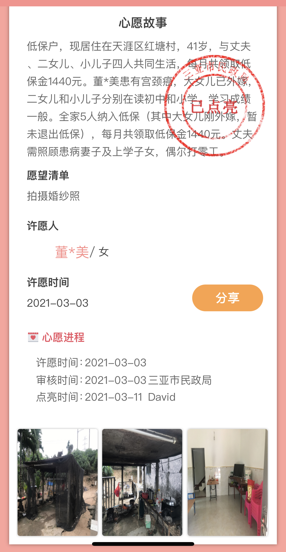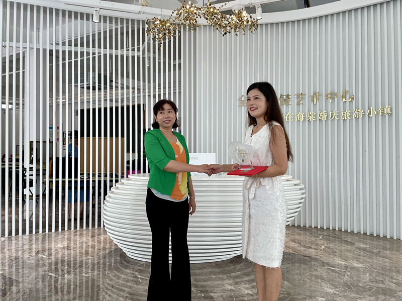 爱在海棠婚嫁事业部的组员们原计划专车接送董女士一家,来到爱在海棠国际婚旅小镇全球婚链艺术中心-礼服馆,为她挑选心仪的婚纱,化上美美的新娘妆,在小镇婚拍场景与外景旅拍基地拍几套中式和海岛风情的婚纱照,再为她办场微婚礼,记录美好First Look。但从本次公益活动发起单位-三亚市民政局的工作人员口中得知:她因重症不便舟车劳顿,我们决定打包礼服及拍摄装备,上门圆梦。我们咨询董女士夫妇的身高、体重和尺码,她的爱人没有穿过黑色皮鞋,提前联系她本人预约时间与拍摄前的温馨提示。当然,一路上也遇到些小问题,比如车身高过不桥洞,无法导航路线,询问附近村民,绕过田间,穿过巷子,才见到等在村口迎接的夫妇。她爱人一脸幸福,手忙脚乱给我们砍椰子,没有吸管,摄影师助理接过砍刀,截了几支细竹子代替吸管,众人拍手叫绝。盛开的鸡蛋花树下,化妆师为她修整妆容,爱人在一旁憨憨的看着今日光彩夺目的“新娘子”。村里街坊邻居纷纷围观,司机停车接上穿着中式礼服的夫妇,再次出发前往天涯海角婚纱拍摄基地。盛装坐前排的二人难免有些拘谨,更像一对新婚夫妇。